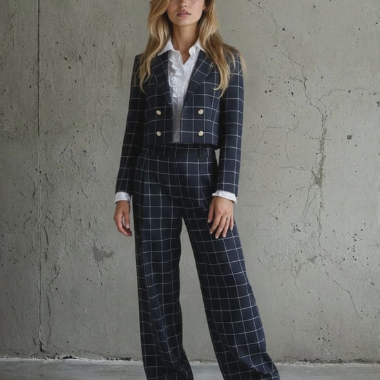Entdecke unsere kurze Jacke aus dem edlen Business Check Stoff.