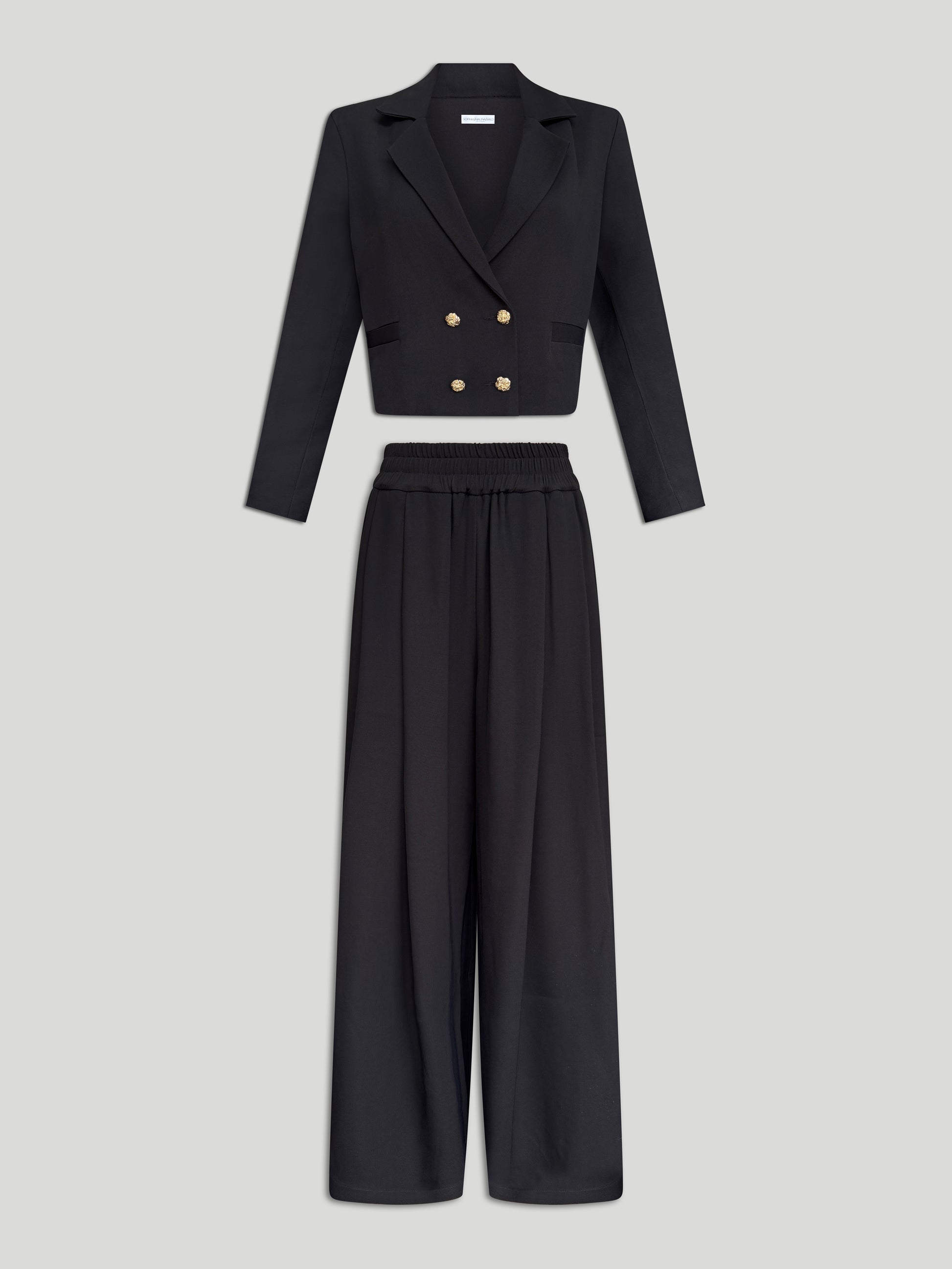 Entdecke unseren Zweiteiler in schwarz mit edlen goldenen Knöpfen.